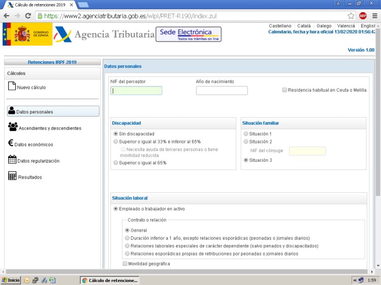 A mano izquierda están los apartados a completar, datos personales, familiares y datos económicos, naturalmente al tratarse de una simulación deberéis poner los rendimientos brutos estimados ( los de la tabla salarial más aprox. las variables) las cotizaciones de la seguridad social aplicando el 4,7% s/ el bruto de los ingresos integros.